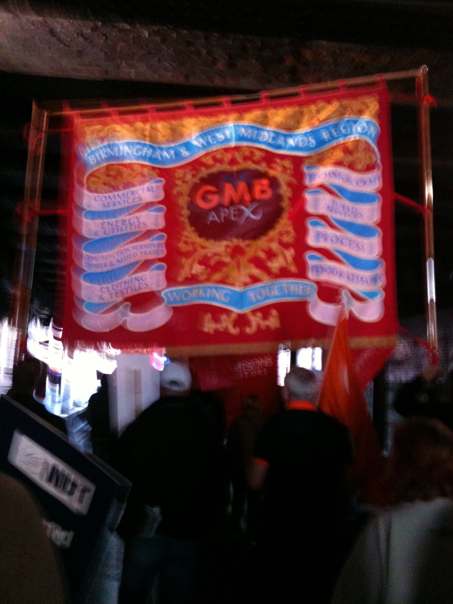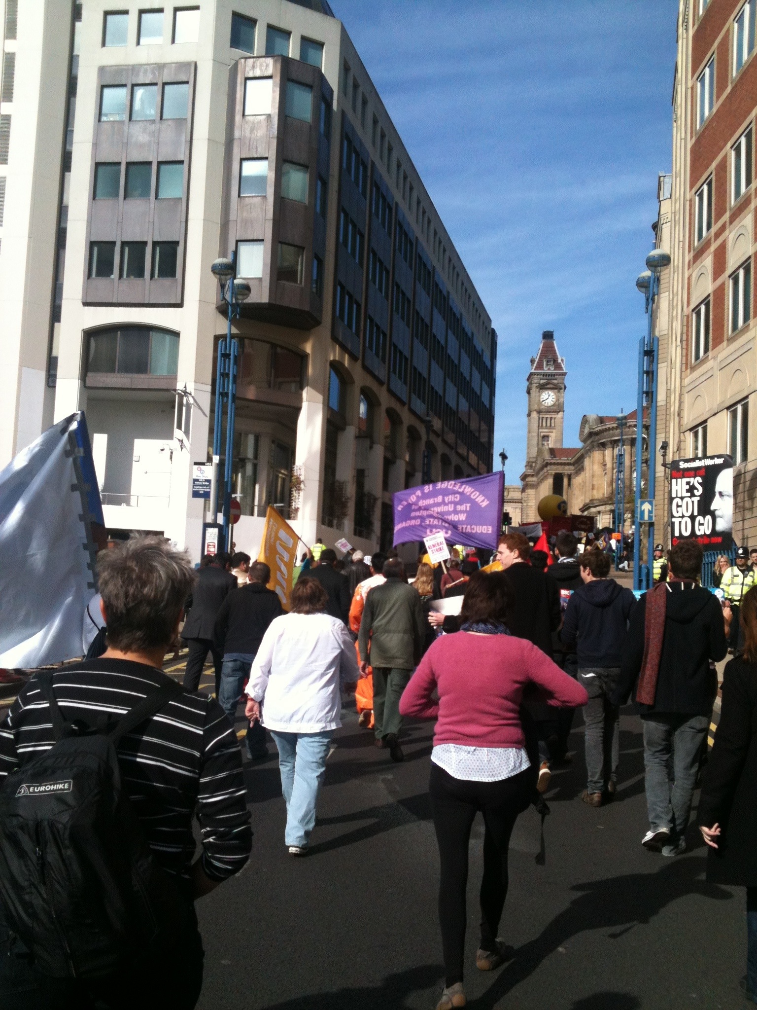 Banners lowered to pass under the Queensway and the canal in Holliday Street, then onto Broad Street past the cheering Sunday shoppers and wheeled right past uncomfortable-looking suits behind the police lines: conference delegates, perhaps?